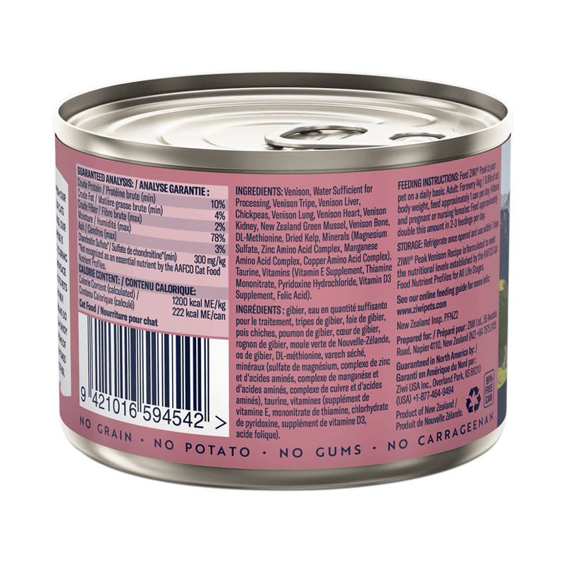 許多貓的飲水意慾都較低,牠們可以受益於罐裝食品中較高的水分含量。ZiwiPeak 巔峰的貓罐頭配方不含穀物、馬鈴薯、玉米、小麥、大豆、糖、甘油、卡拉膠、瓊脂、瓜爾膠、三聚磷酸鈉或焦磷酸四鈉。相反,我們使用鷹嘴豆作為高肉含量成分的天然黏合劑。我們的罐頭也有不含 BPA。