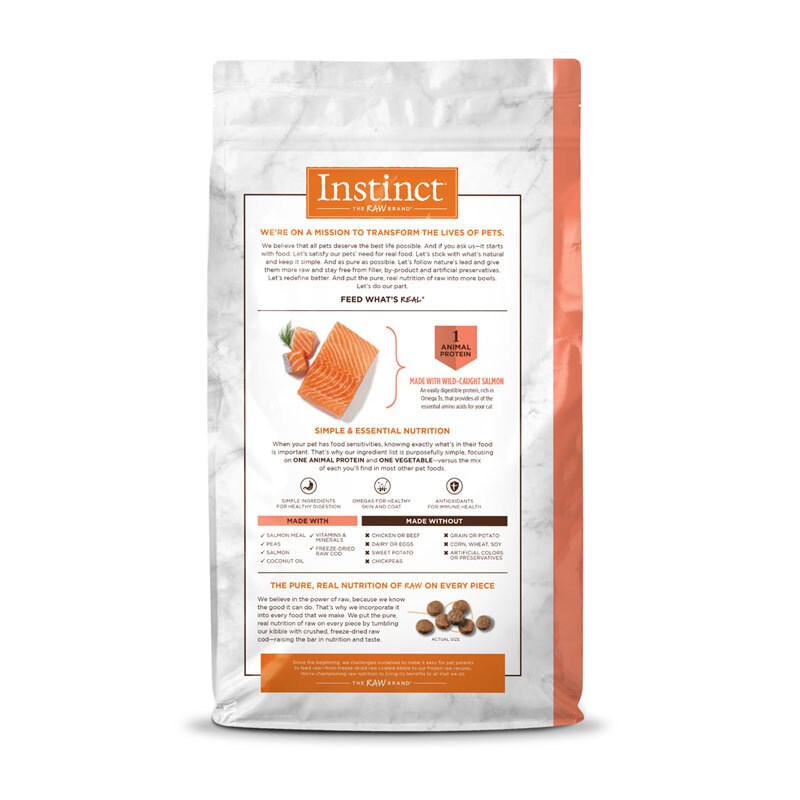 三文魚粉、豌豆、木薯粉、菜籽油 (用混合生育酚和檸檬酸保存)、三文魚、天然香料、椰子油、蒙脫土、鹽、氯化鉀、維他命 (維他命 E 補充劑、L-抗壞血酸-2-多磷酸鹽、菸鹼酸) 補充劑、甲萘醌亞硫酸氫鈉複合物、硝酸硫胺素、d-泛酸鈣、維他命 A 補充劑、核黃素補充劑、鹽酸吡哆醇、維他命 B12 補充劑、葉酸、維他命 D3 補充劑、生物素)、礦物質 (蛋白鋅、蛋白鐵、蛋白銅、蛋白錳、亞硒酸鈉、乙二胺二氫碘化物、氯化膽鹼、冷凍乾燥鱈魚、牛磺酸、迷迭香萃取物。