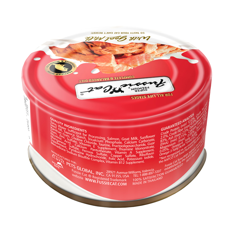 Fussie Cat 高竇貓極品吞拿魚山羊奶湯汁主食罐含豐富維他命及礦物質提供全面營養,並能補充鈣質鞏固骨骼。