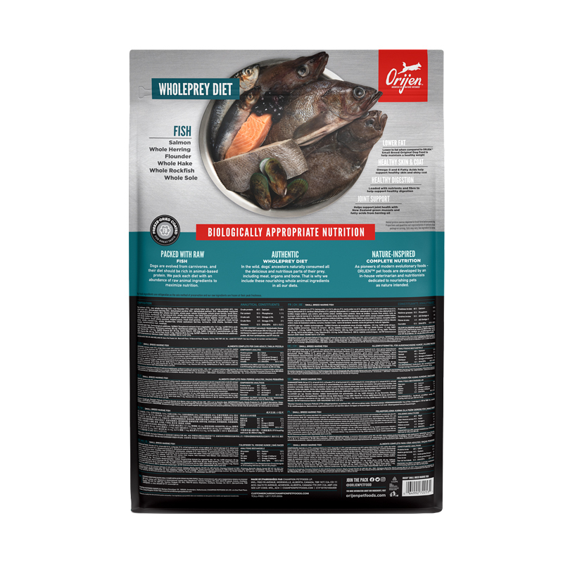 Orijen 渴望小型成犬無榖物海洋魚配方,專為小型犬打造的海洋盛宴,富含 85% 魚肉含量。前六大食材為生鮮魚類:三文魚、完整鯡魚、比目魚、完整鱈魚、完整岩魚及完整鰈魚。使用 WholePreyTM 完整獵食,食材成分包含魚肉、內臟、可食性骨頭,模擬愛犬大自然獵食中,所獲得的完整營養。飼料外層裹上鱈魚肝凍乾塗層,大幅提升嗜口性。我們的野生漁獲食材 2/3 是使用生鮮的魚類。1/3 是用生鮮魚肉以 90 度低溫進行溫和脫水,將其精華轉變成豐富的蛋白質來源。小型犬專屬飼料顆粒尺寸,方便小型犬進食。